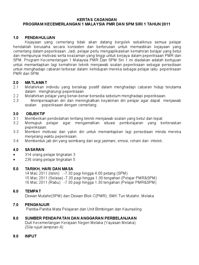 Kertas Cadangan Program Kecemerlangan Spm Dan Pmr Pdf